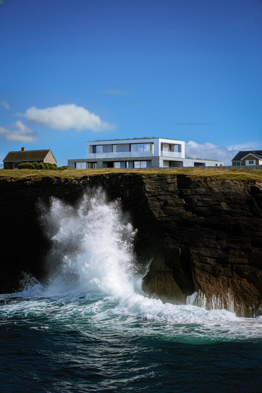 Looking west to an uninterrupted vista of the Irish Sea gives the most remarkable outlook, though comes hand-in-hand with strong prevailing winds and intense weather conditions. Given the unique and challenging elements, the proposed design must use the industry’s most robust construction methodologies and practices. Super insulated fabric, high performing materials, robust glazing, and a series of calm and simplistic architectural principals were chosen.