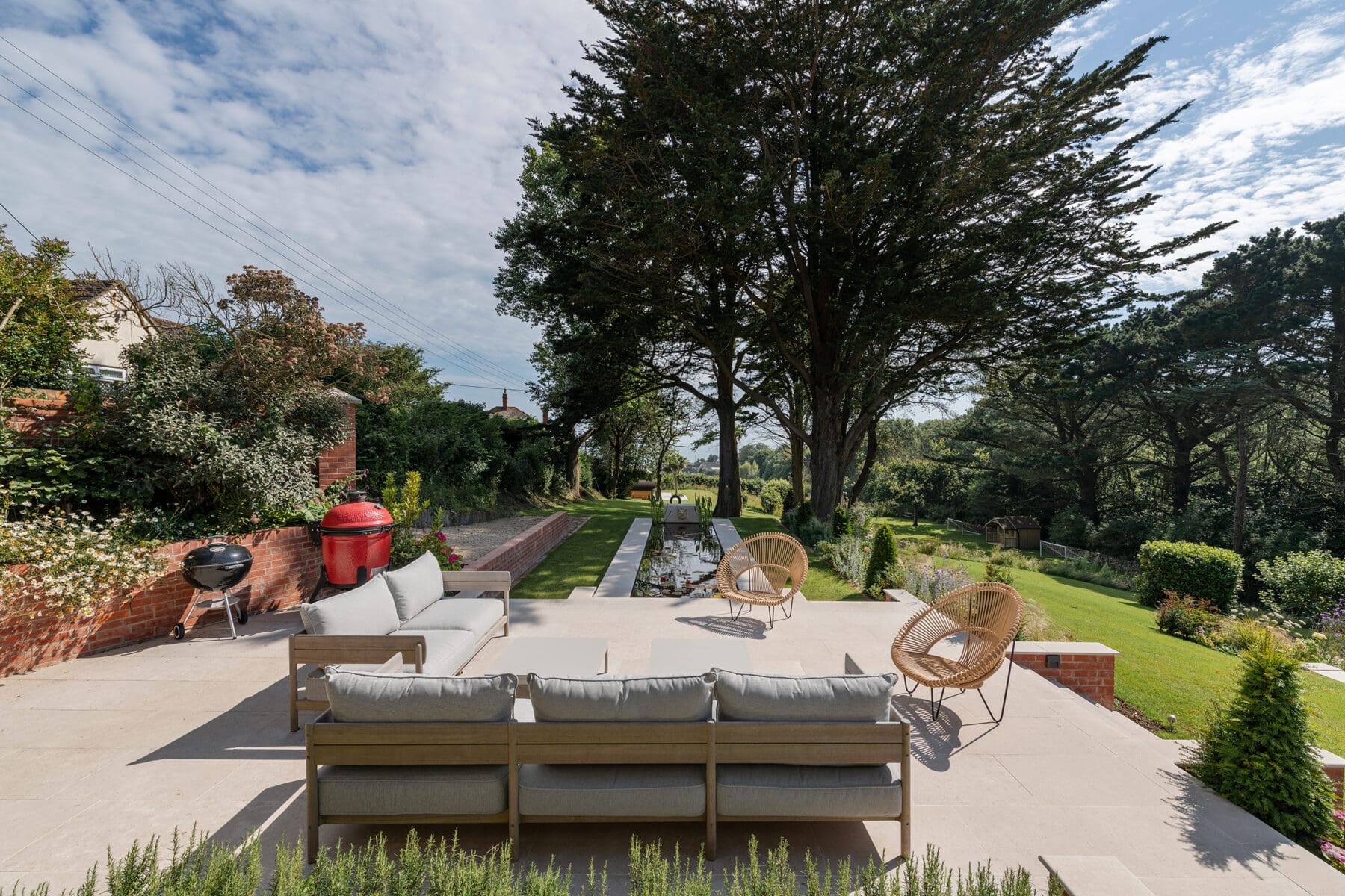 Our new Southern extension is heavily glazed on two sides, to take in open-water views beyond the formal gardens to the South, designed by Tabitha Tarling, and rolling Dorset hills to the West. The contemporary volume creates areas of shelter and framing externally with deep overhanging soffits, and the motorised open-corner Schüco glazing allows for an inside/outside living experience.