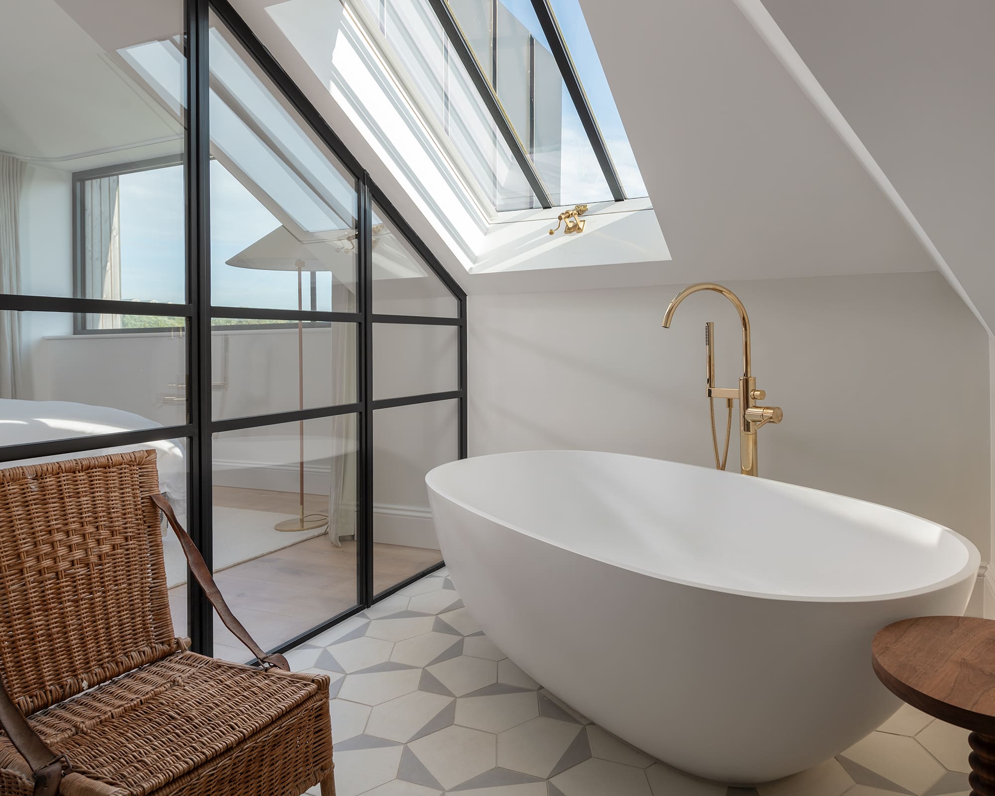 The dormer to the second floor is designed to respond to the architectural features of the glazed sunroom beneath, with deep timber soffits wrapping around large minimal framed panels of glass, flooding the new principal suite with in-direct light and far-reaching ocean views.