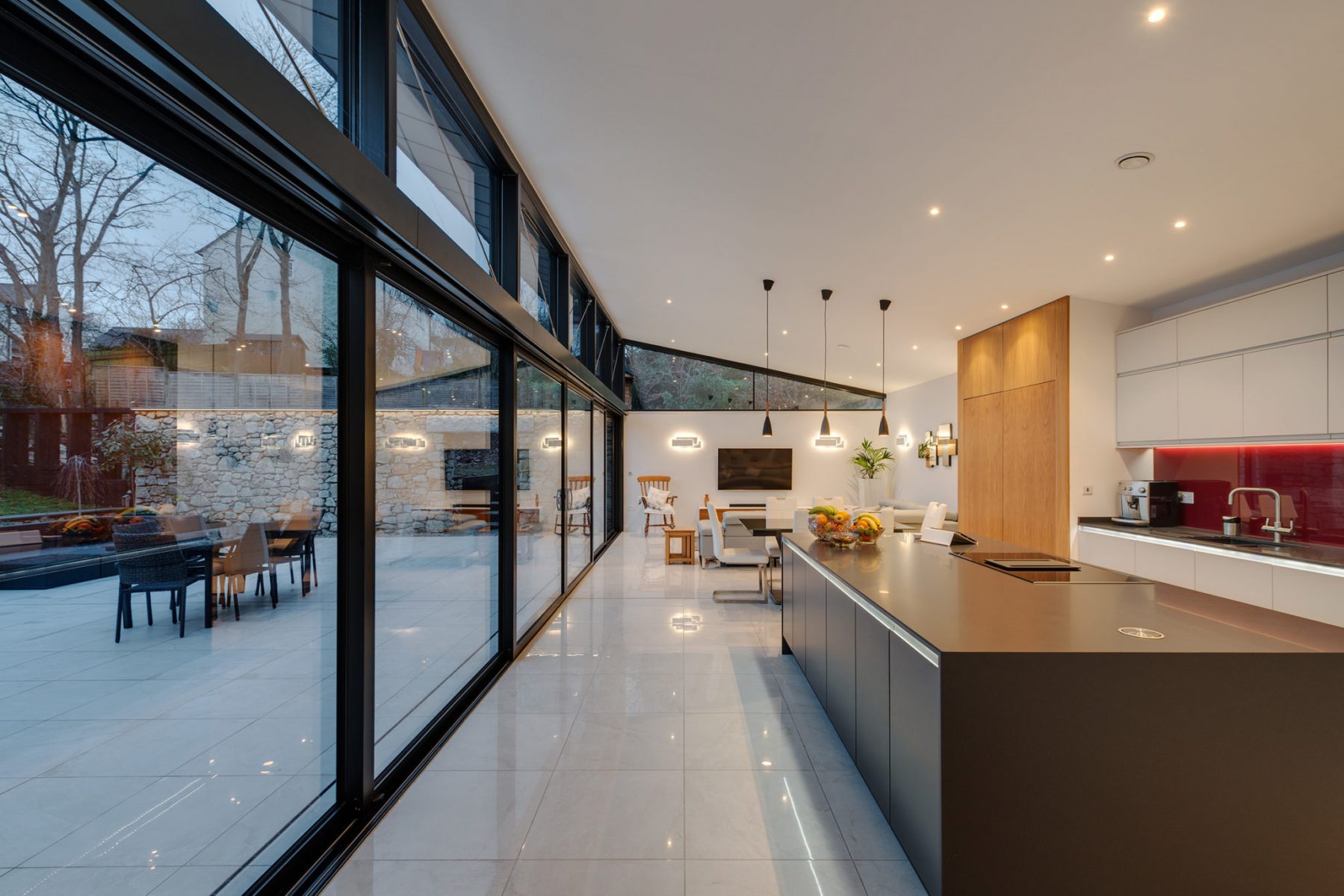 The house is roofed in zinc with a twisting surface that provides height and drama in the main room of the house, above the glazed wall. This mono pitch roof creates a bespoke triangular window at the end of the living space – providing a glimpse of the trees beyond as you look through the length of the room. An 11m run of sliding doors are able to fully open up the living space to the courtyard garden. One large bespoke steel girder allows this huge expanse of sliding doors to be free of any columns.