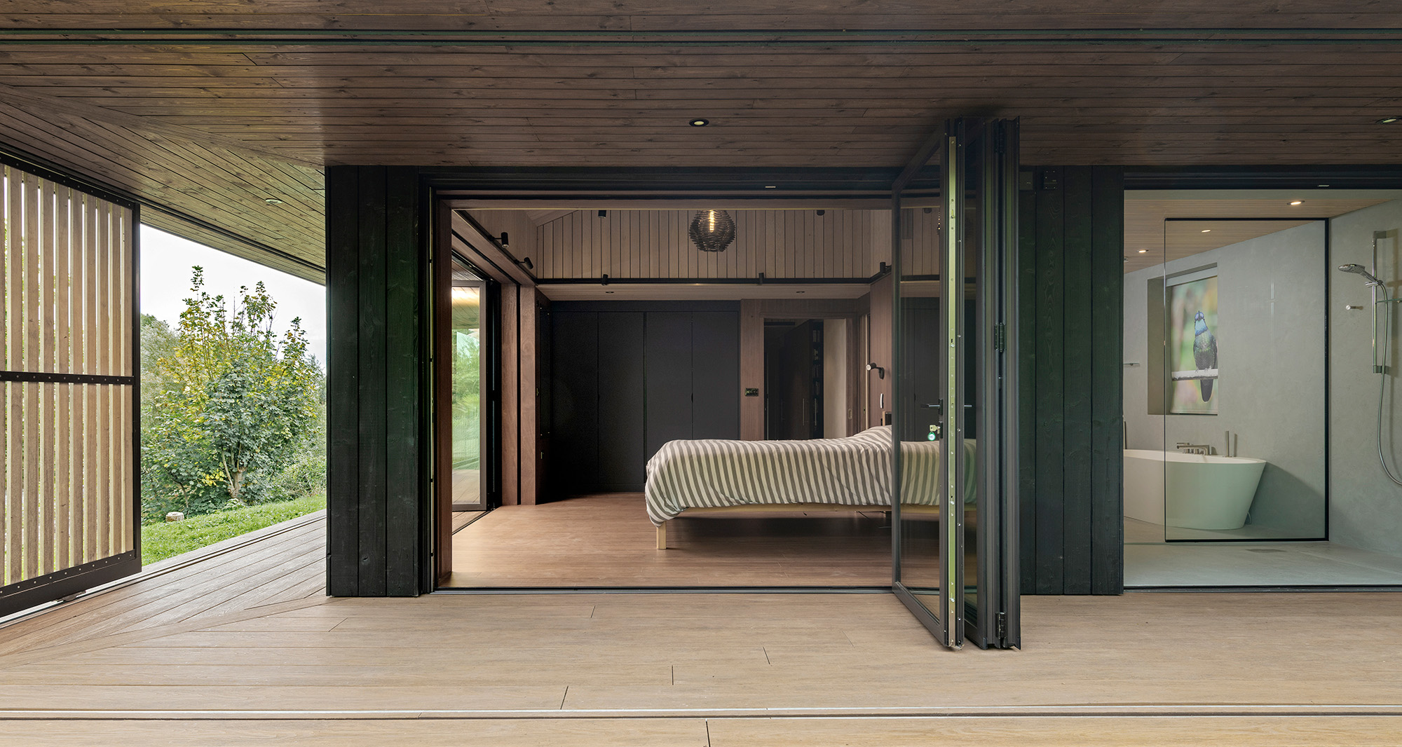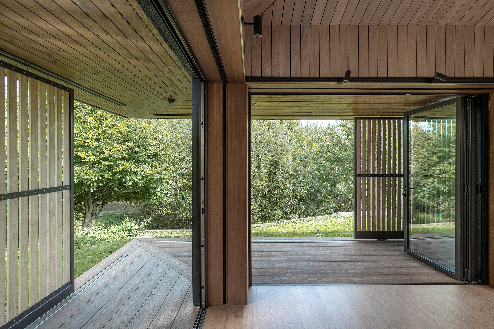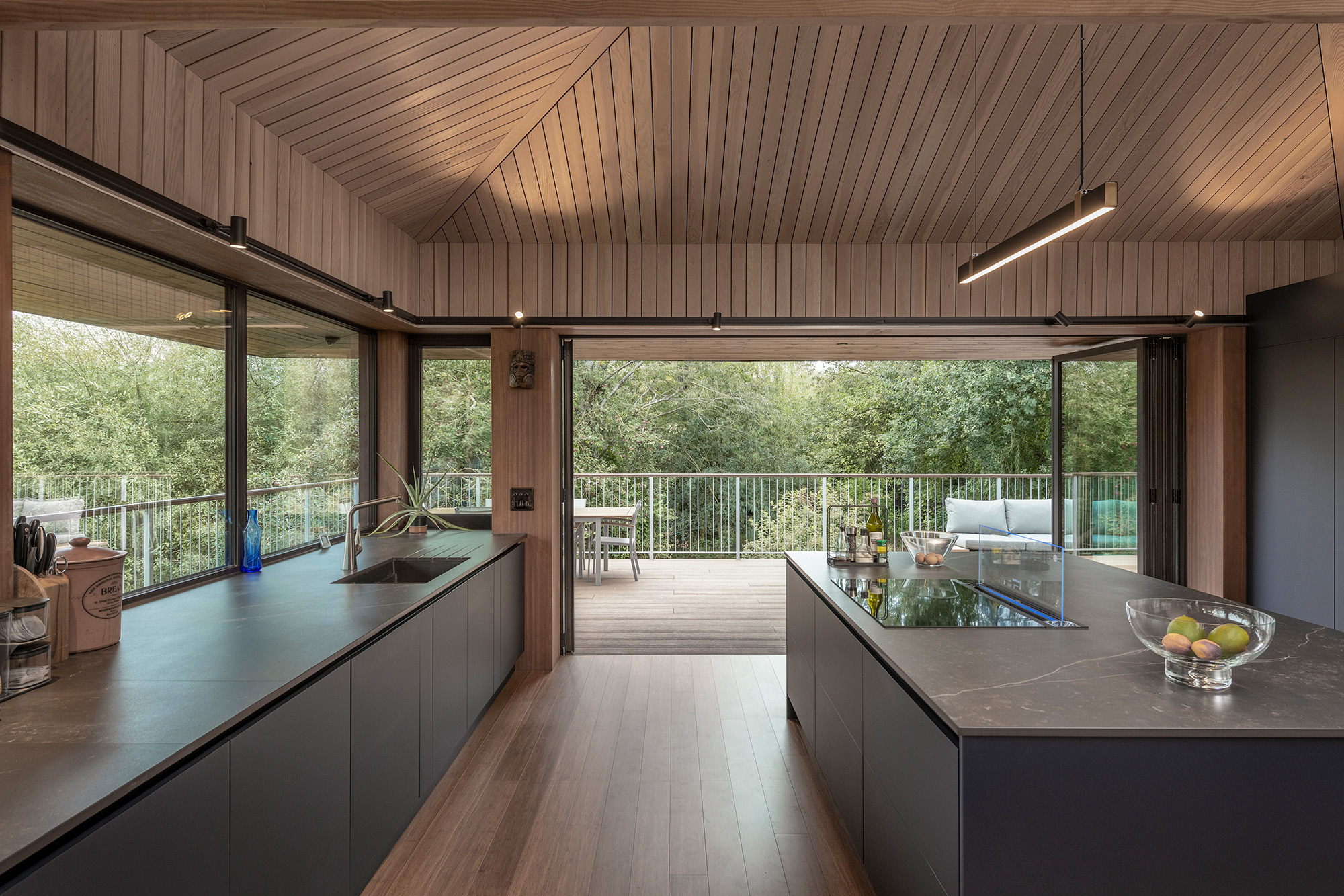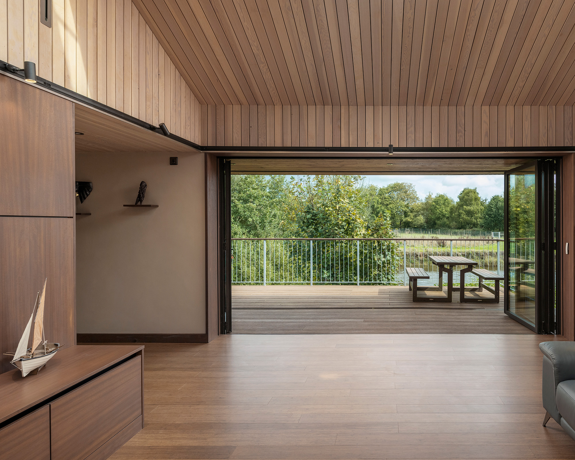 The layout draws inspiration from the traditional Devon longhouse — a simple, elongated plan divided into two clear zones: living spaces at one end, bedrooms at the other, and a central entrance hall acting as the threshold. This arrangement reflects the client’s desire for clarity and connection to place. A keen wildlife photographer, the client also sought strong links between the home and its riverside setting. A key feature is the long glazed wall facing the river, incorporating sliding doors and timber privacy screens to frame views of the ever-changing wetland landscape throughout the year.