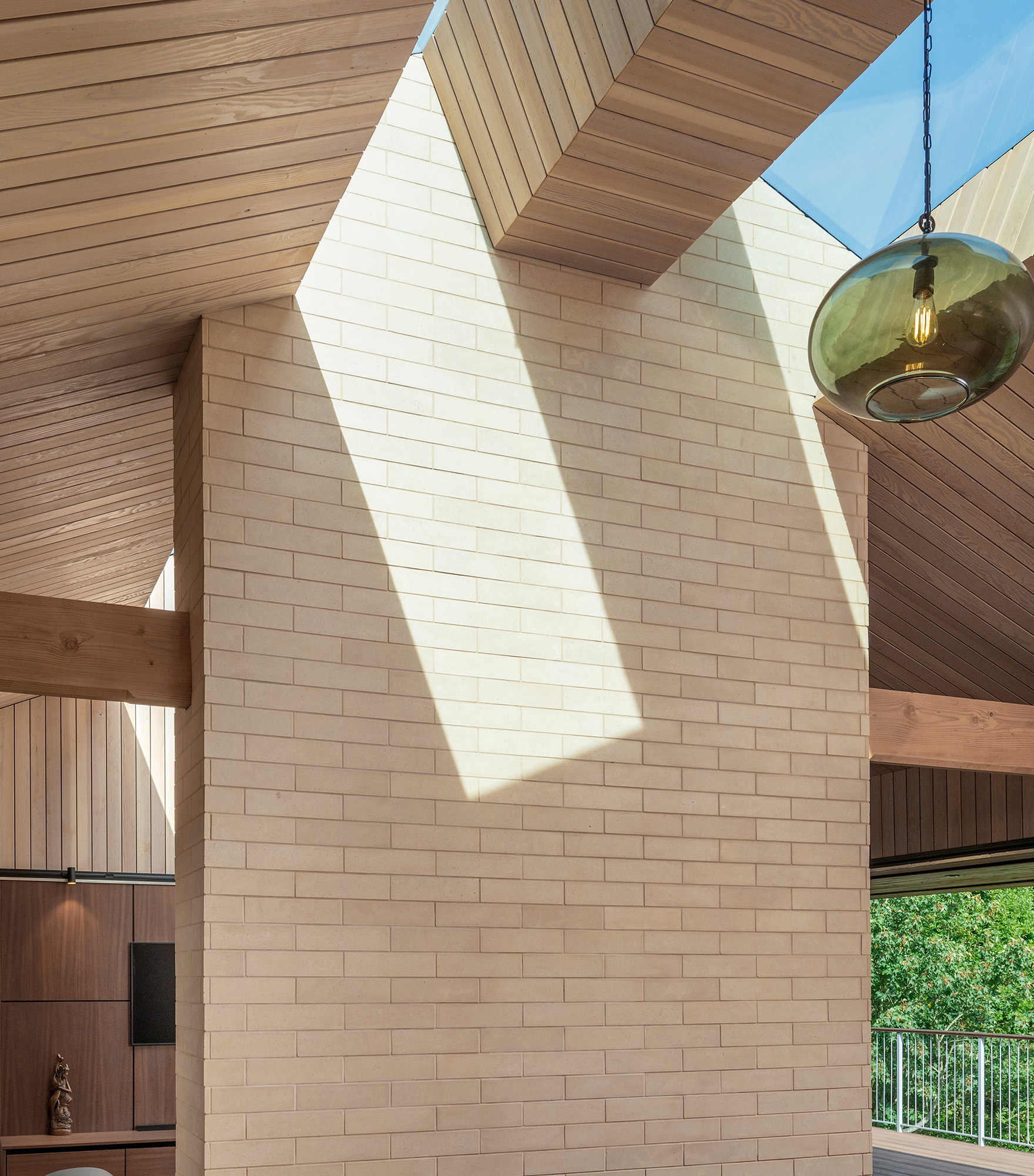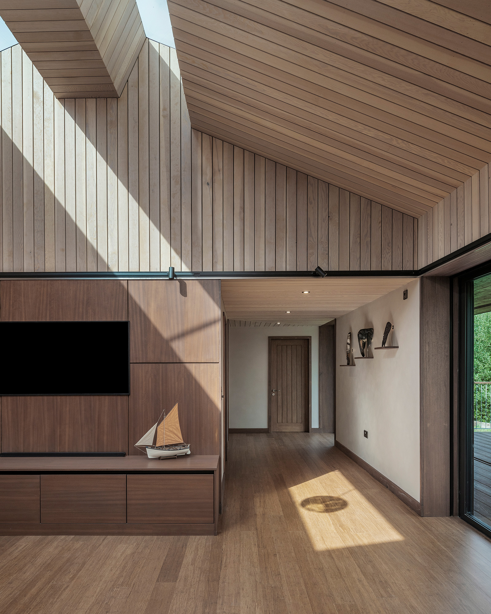 Internally, the vaulted roof form is lined with timber, enhancing the volume and adding warmth and texture throughout. Veneered timber joinery, white brick-tiled feature walls, and bamboo flooring provide a refined yet natural interior palette. The house also adopts a low-carbon, sustainable approach to energy, with timber frame construction, high levels of insulation, air source heat pumps, and MVHR (mechanical ventilation with heat recovery) systems all contributing to its performance.