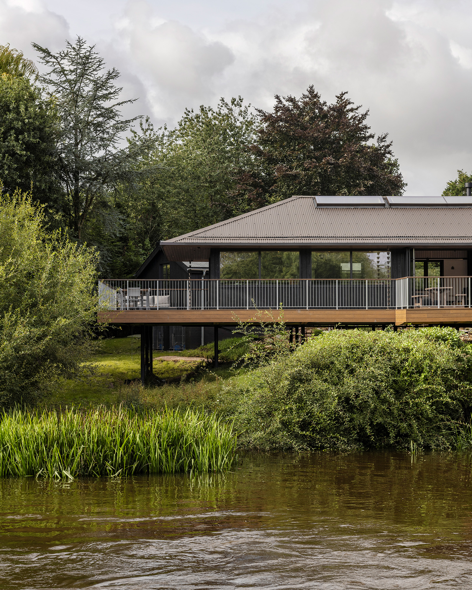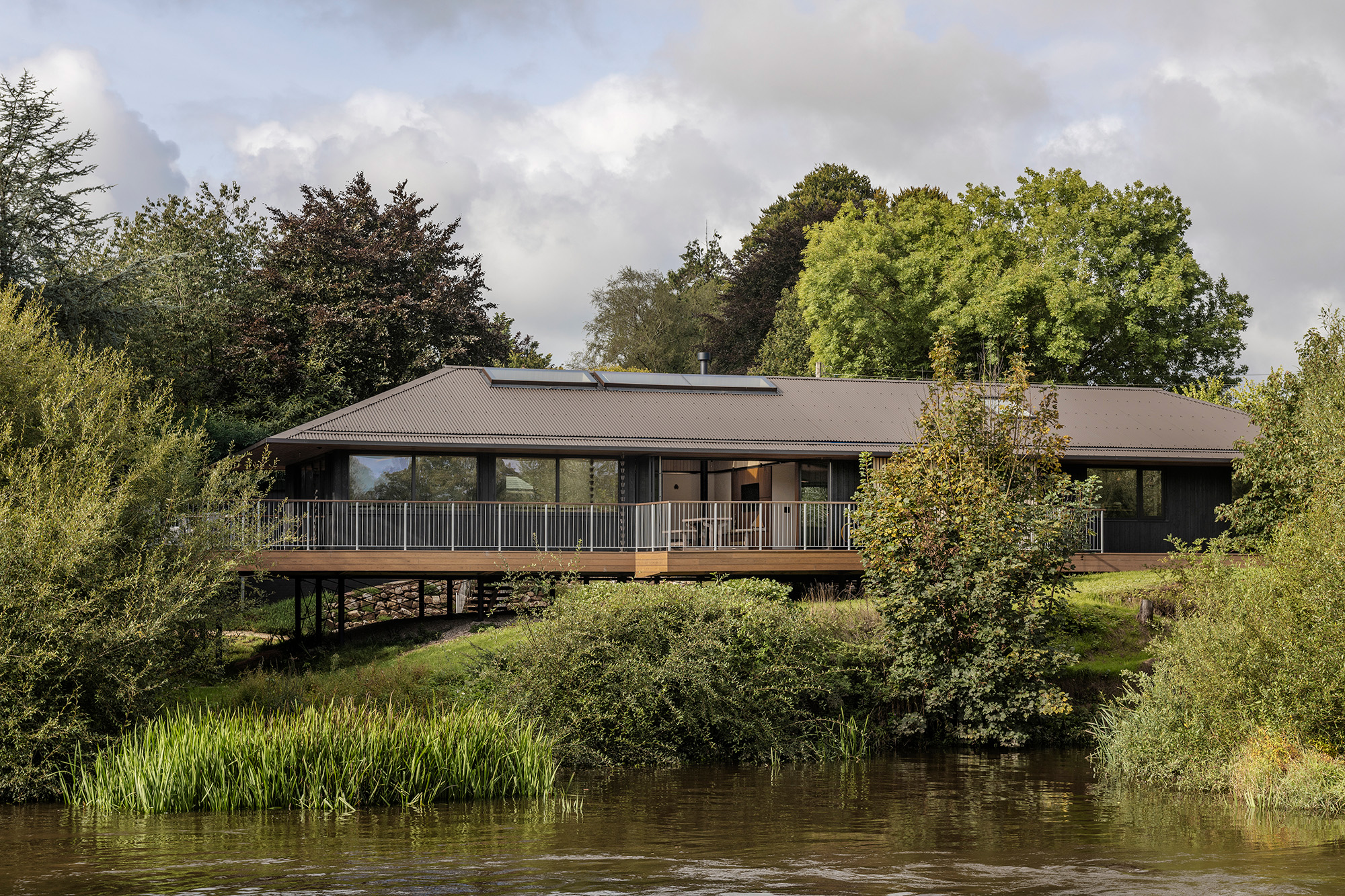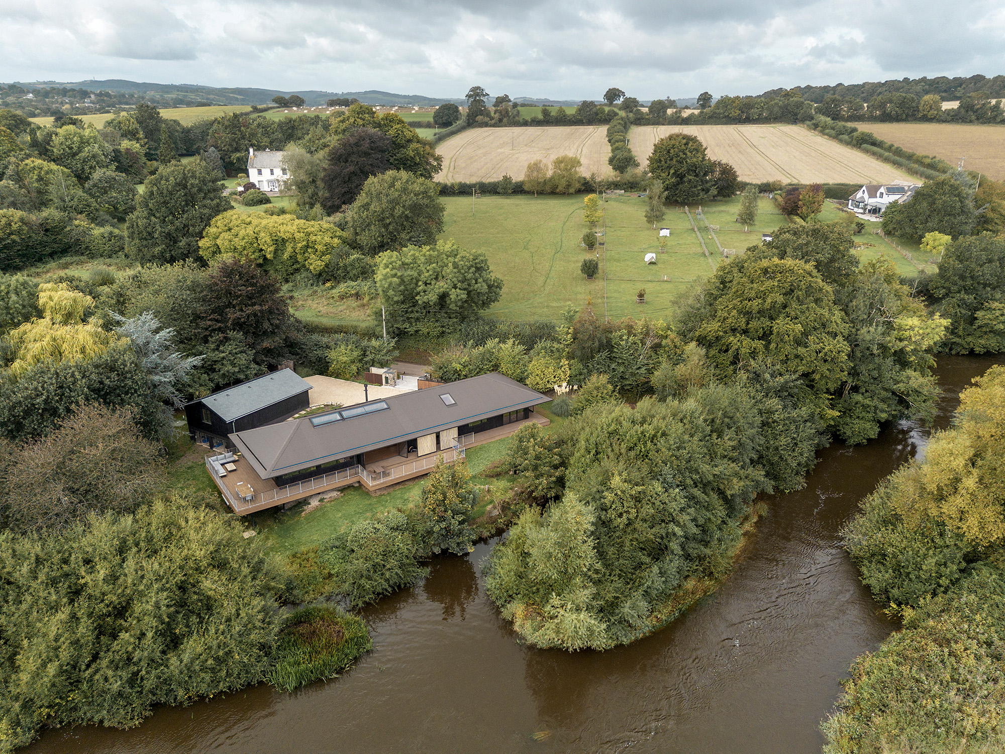 Stipperstones is a new replacement dwelling, single-storey, three-bedroom home on the banks of the River Exe in Devon. It replaces a prefabricated concrete bungalow that previously occupied the site. Elevated on stilts above the riverbank, the new home is designed to sit lightly in the landscape, its low-lying, linear form and prominent roofscape blending seamlessly with the natural surroundings.