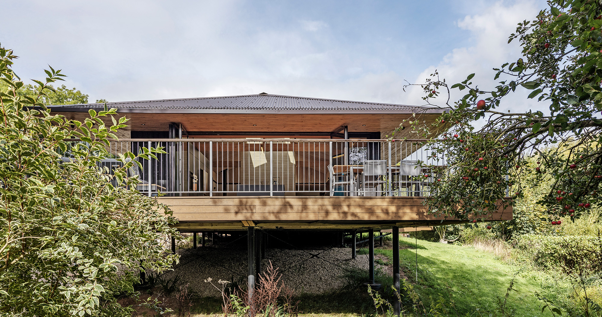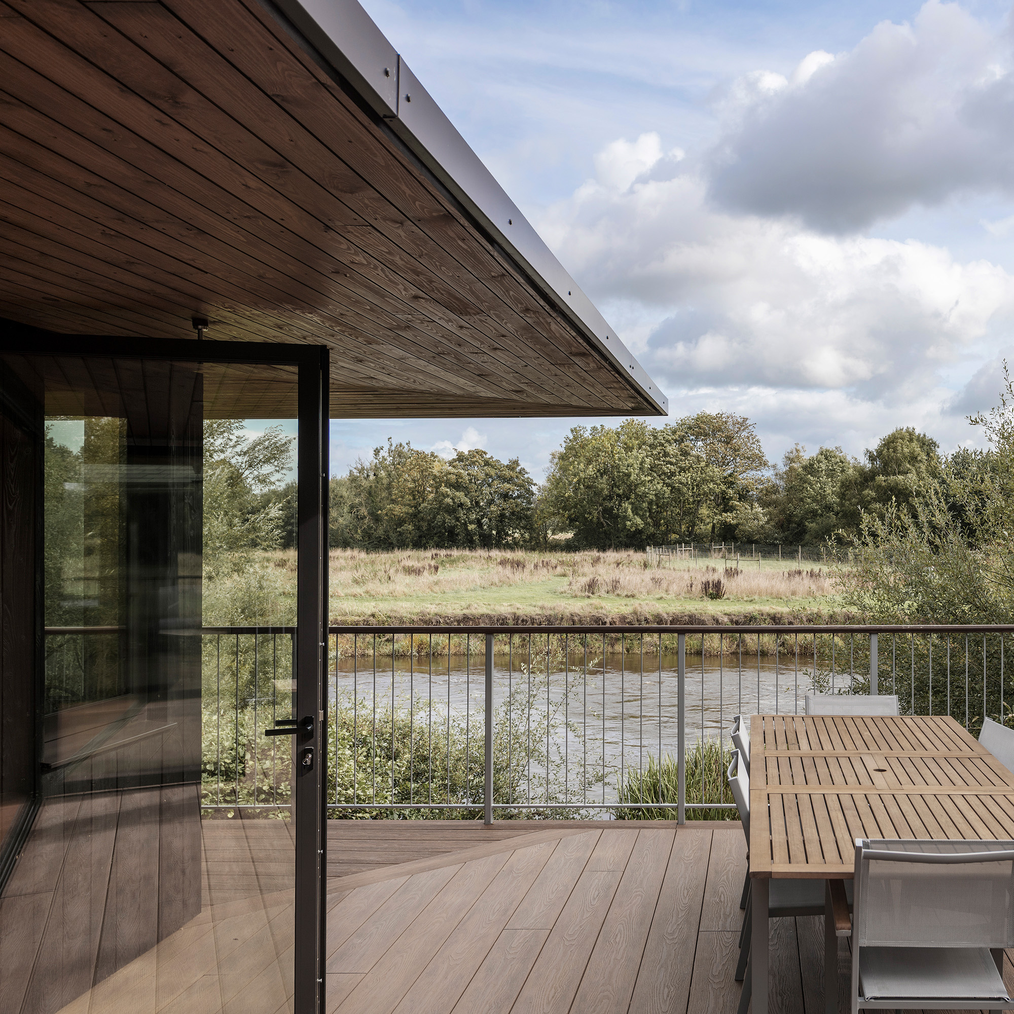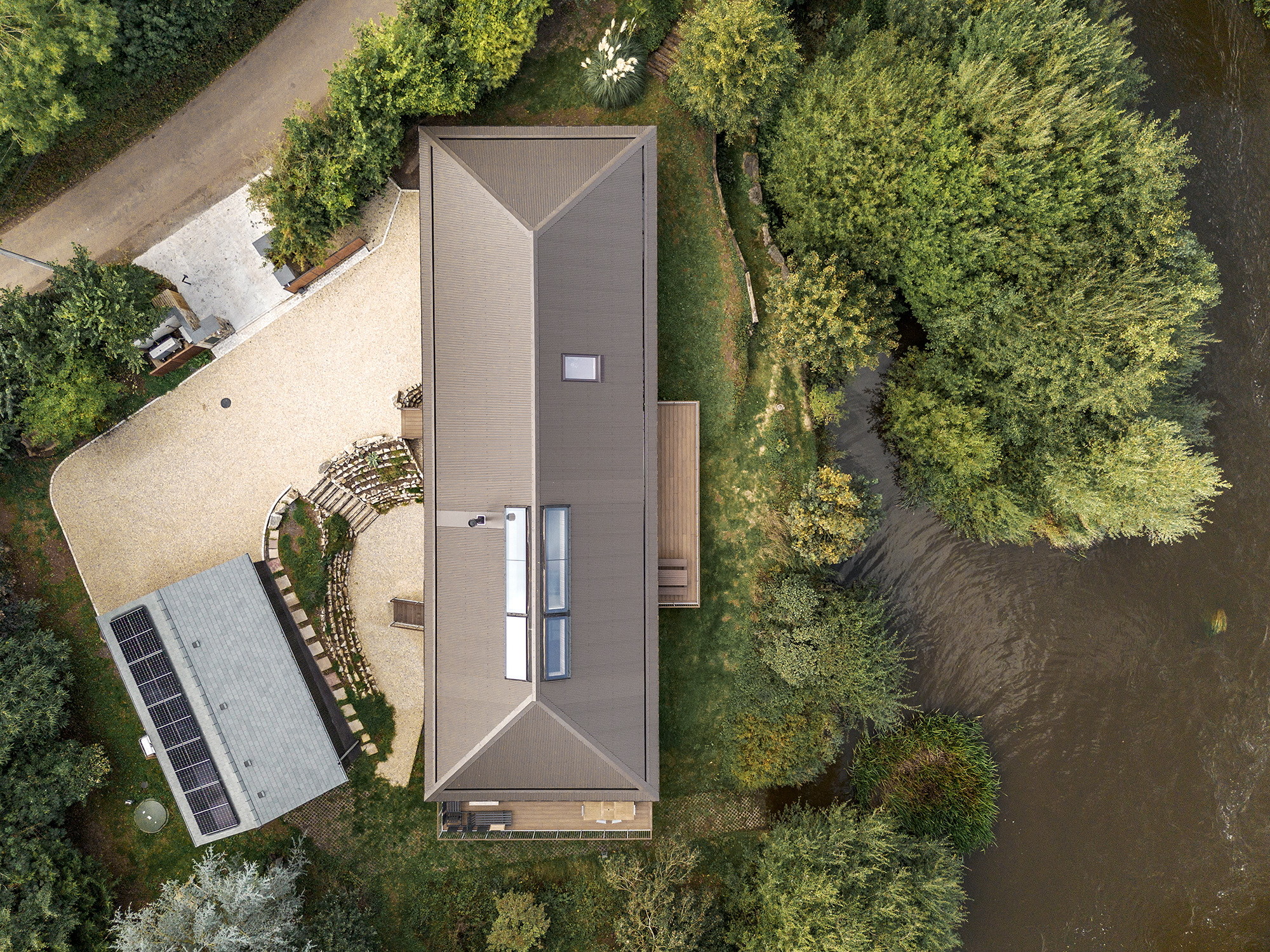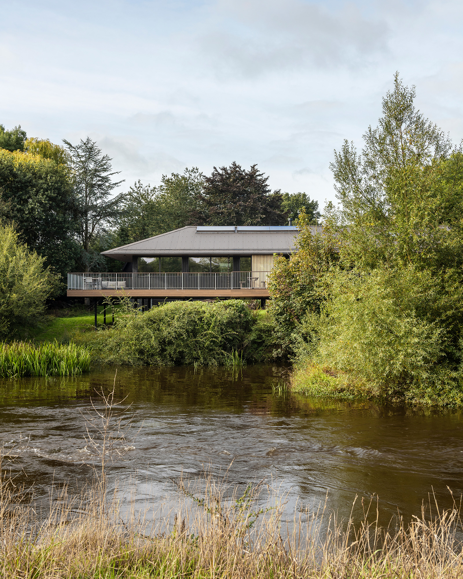 Stipperstones is a new replacement dwelling, single-storey, three-bedroom home on the banks of the River Exe in Devon. It replaces a prefabricated concrete bungalow that previously occupied the site. Elevated on stilts above the riverbank, the new home is designed to sit lightly in the landscape, its low-lying, linear form and prominent roofscape blending seamlessly with the natural surroundings.