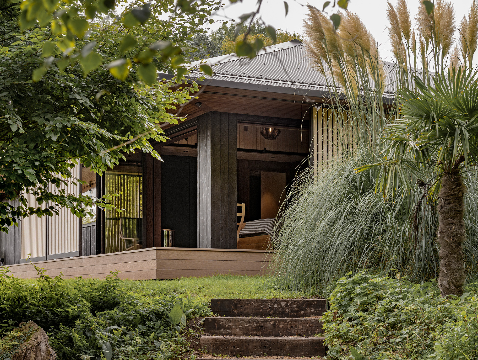 Surrounding the house, a floating deck allows for outdoor living and quiet observation of the tree-lined river. The kitchen, dining, and living spaces open directly onto this deck, which sits above the home’s private slipway. The principal bedroom also enjoys access to a private outdoor deck, complete with sliding timber privacy screens, while the en-suite bathroom opens fully to the garden for a secluded outdoor bathing experience.
