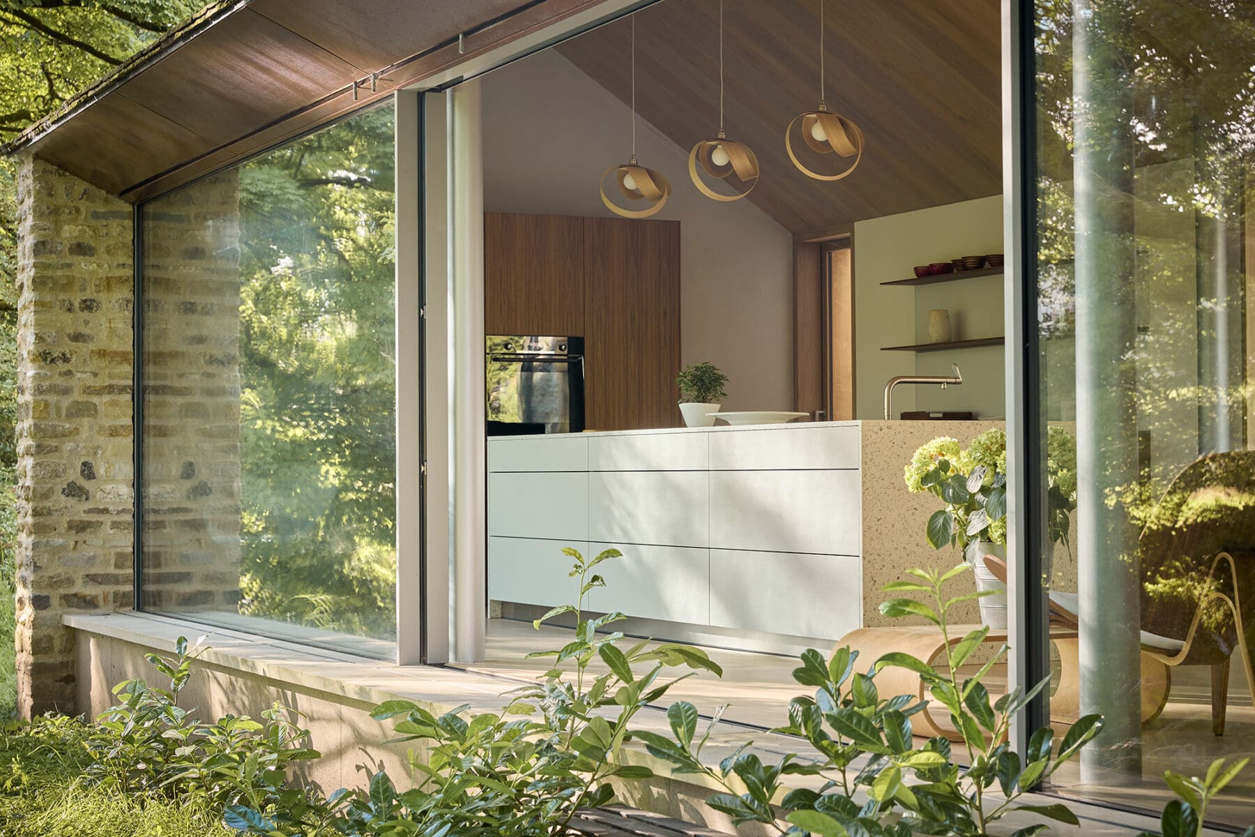 The extension adopts a different geometry to Sycamore House, aligned with the river course, which is only 1m away at its closest. The design looks to create an unobstructed panoramic experience, using full-width, floor to ceiling glass sliding doors. The raking soffit is clad with copper panels. Hidden gutters allow a sharp edge profile to the roof with inset metal rainwater channels, recessed within the stone gable walls.
