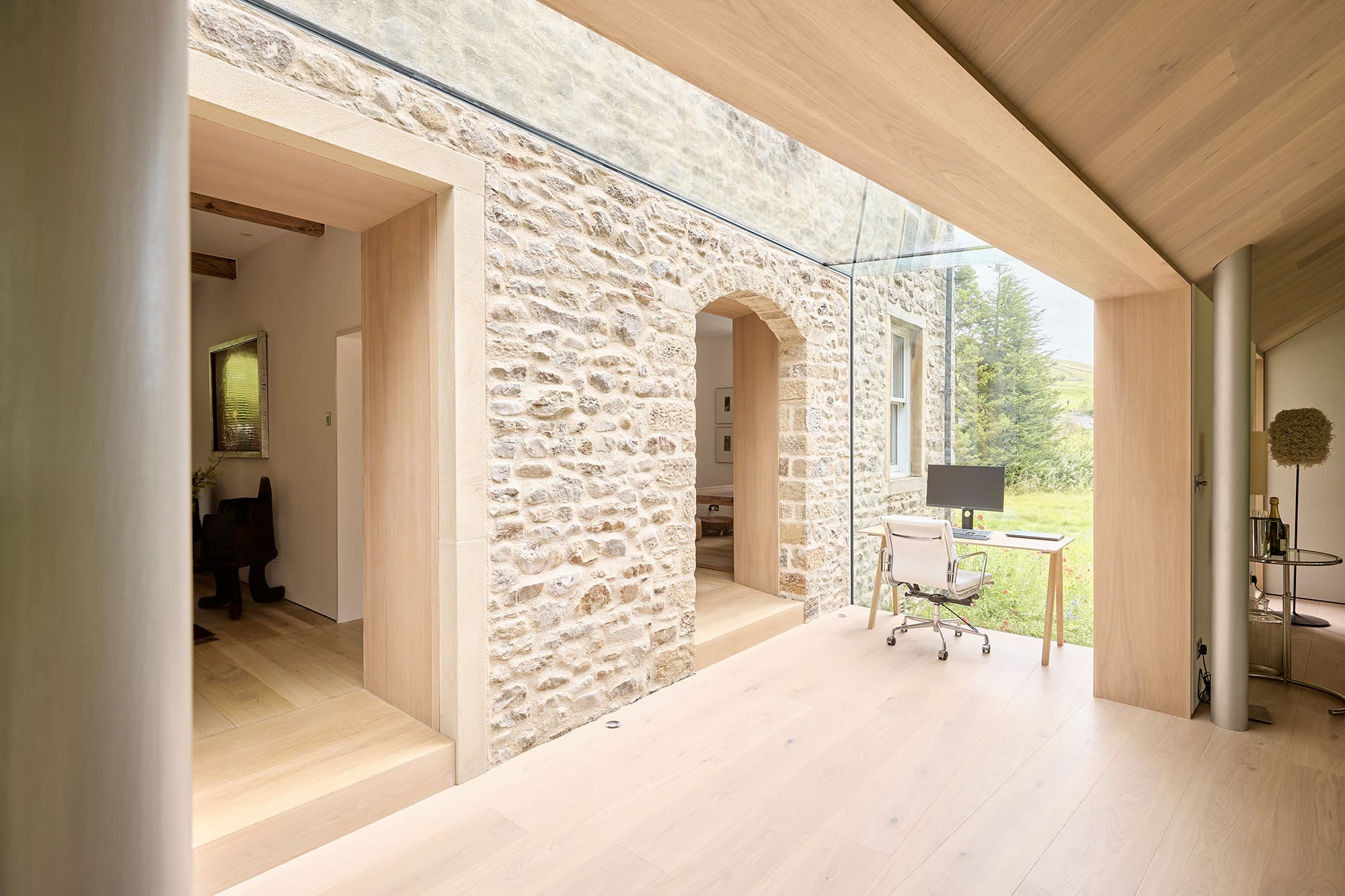 The extension at Sycamore House provides a single, vaulted space uninterrupted by structure, that houses an elegant Bulthaup kitchen and dining room. The pitched roof, finished in the same split limestone, floats above a wall-to-wall run of Skyframe glass sliding doors. The extension is delicately linked to the house via structural glass by Cantifix . This provides breathing space between the house and extension and a clear separation of old and new. The home office sits modestly within this space, enjoying views towards the village and distant moors. Cut and dressed limestone reveals within the existing house walls provide routes through the house.