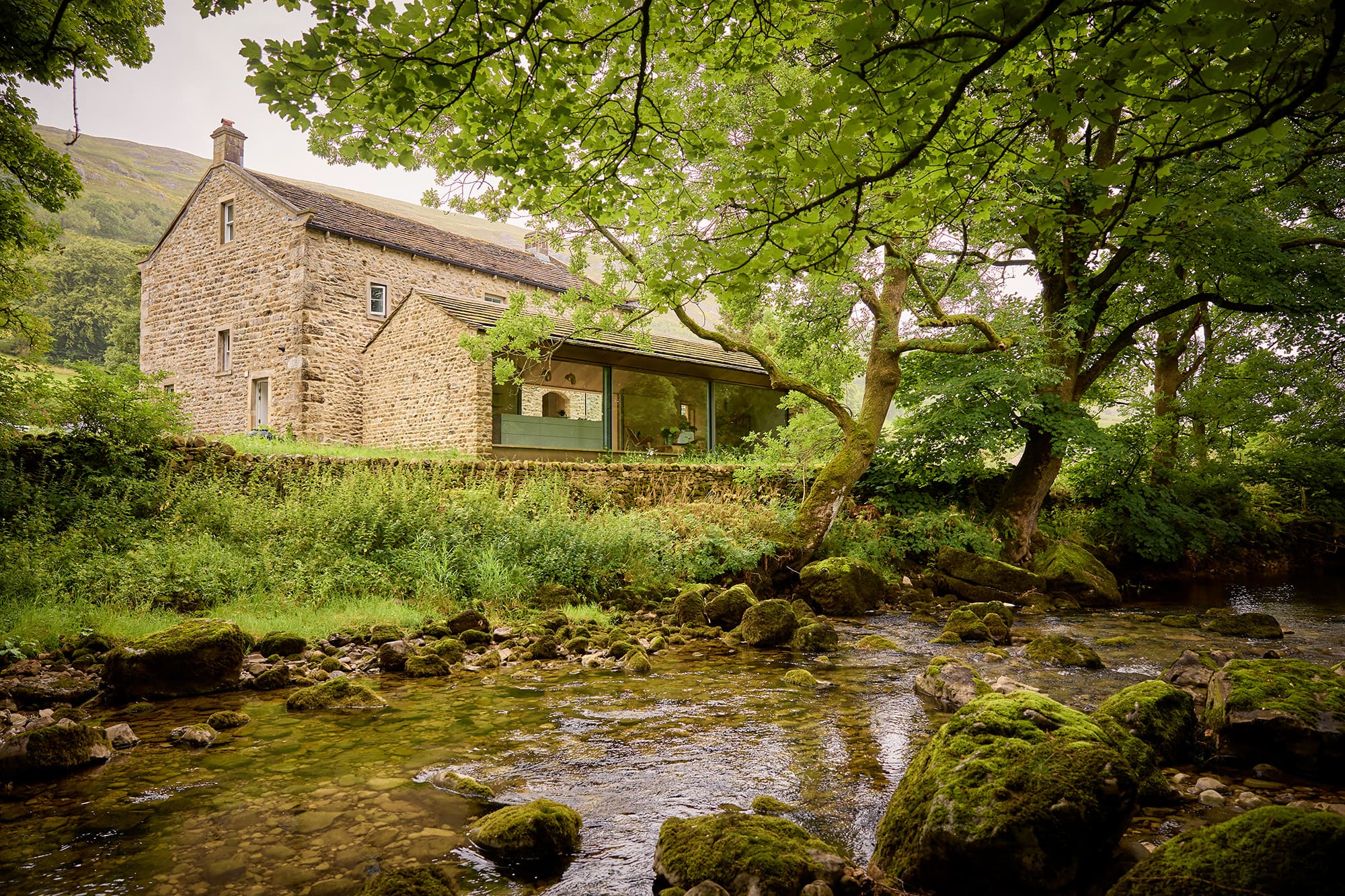 The client required a new extension to accommodate a large open plan kitchen-dining room and home office space, that celebrated the connection with the immediate, tree-lined riverside. The agreed architectural direction pursued a simple, vernacular form, subservient to the main house, however the architectural expression between the traditional stone gable walls is unapologetically modern.