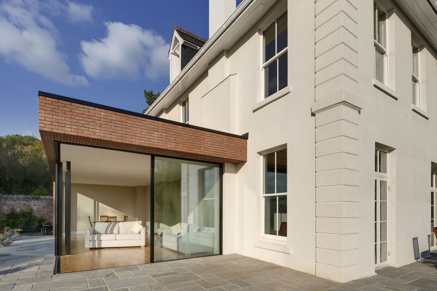 The new Orangery is designed as an extension of the original brick garden wall, wrapping around the side of the Southern elevation. Its simplistic form, with large glazed openings and flat roof provide a calm and restrained addition, allowing the architecture of the main house to dominate. A thin, Dutch brick has been chosen as the predominant facing material, wrapping underneath the generous overhangs to form the soffit. The structure will be steel frame which, teamed with a high performance glazing system, will allow clear openings with no supporting structure at the predominant corner.
